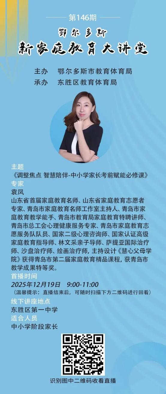 为深入贯彻习近平总书记关于家庭家教家风建设的重要论述,落实《鄂尔多斯市“暖城家教”校家社协同育人品质提升行动实施方案(2024-2026)》要求,帮助中小学家长破解考前育儿焦虑,12月19日,第146期“新家庭教育大讲堂”在东胜区第一中学开讲。活动由鄂尔多斯市教育体育局主办、东胜区教育体育局承办,采用“线下讲座+线上直播”双线模式,覆盖全市中小学家长。