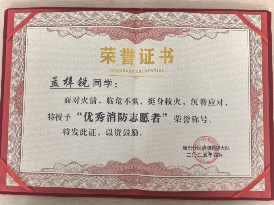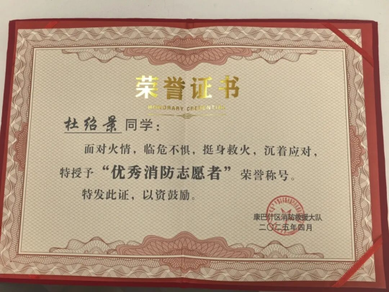 2025年5月12日是第17个全国防灾减灾日,康巴什区消防救援大队鲁丹琦、孙智两位同志专程来到学校,为689班孟梓锐、691班杜绍景两位同学颁发“优秀消防志愿者”荣誉证书。