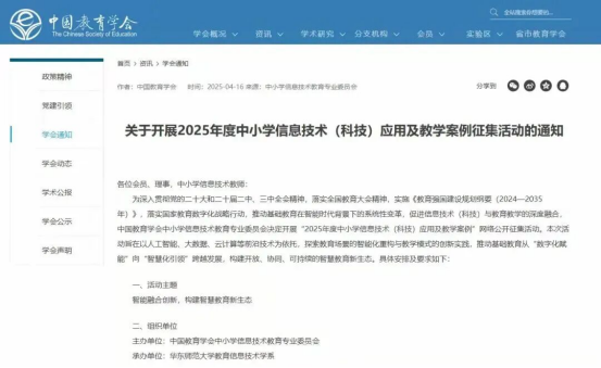 为促进国家信息技术(科技)新课程标准的落地实施,推动信息技术在各个学科中的深度整合应用,中国教育学会中小学信息技术教育专业委员会联合华东师范大学教育信息技术学系开展了“2025年度中小学信息技术(科技)应用及教学案例”网络公开征集活动。