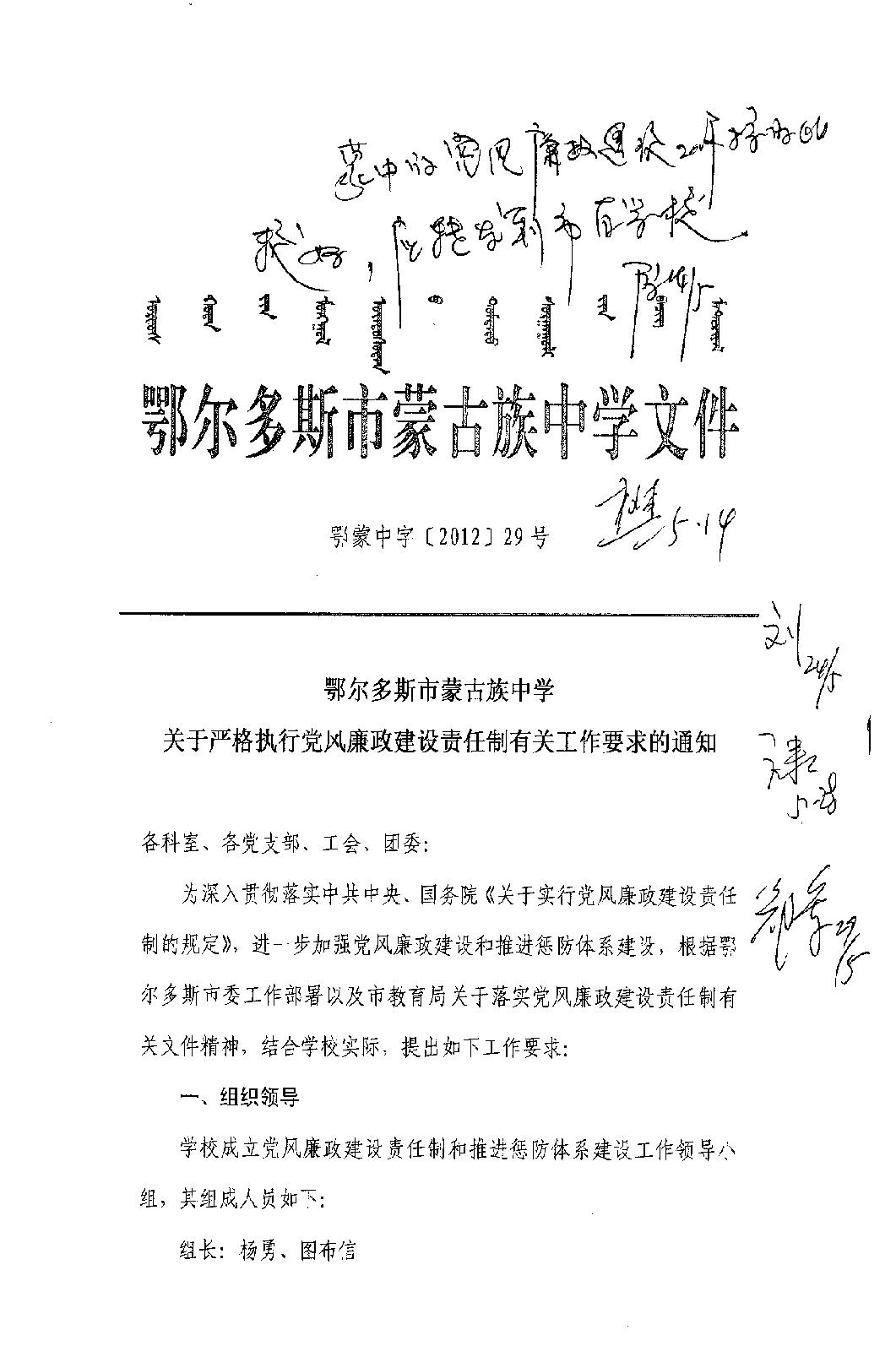 鄂尔多斯市蒙古族中学关于严格执行党风廉政建设责任制有关工作要求的通知
