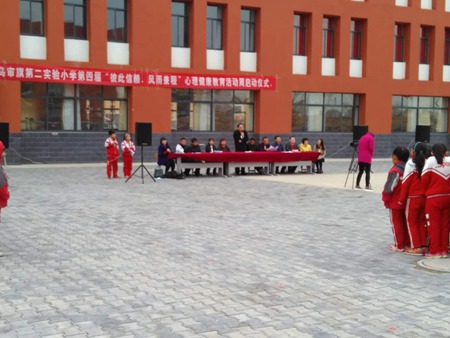 11月23日 ,乌审旗第二实验小学举行了第四届“彼此信赖,风雨兼程”心理健康教育活动周启动仪式。启动仪式邀请到了乌审旗教育局德育张彦刚主任、乌审旗青少年活动中心乌兰托娅老师和学校相关领导参加,全校1455名在校学生和部分老师也全程参与了此次活动。