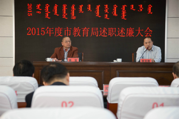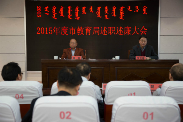 2月2日,市教育局召开2015年度述职述廉大会。市教育局副局长康富、副局长郑军、副局长朝戈,市纪委派驻市教育局纪检组组长安云山,市考试中心主任奇巴雅尔出席会议,市考试中心、局机关17个科室的负责人和工作人员参加了会议。考试中心及各科室负责人围绕2015年工作情况及思想政治状况、廉洁自律情况等方面进行了全面具体的阐述,并明确提出2016年工作思路。