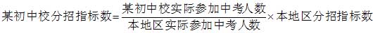 例2:假如市第一中学属地外分招计划353人,鄂托克前旗中学实际参加中考人数为547人,市第一中学在属地外(达拉特旗、准格尔旗、鄂托克前旗、鄂托克旗、杭锦旗、乌审旗及伊金霍洛旗)实际参加中考人数为11301人,那么,市第一中学分配给鄂托克前旗中学的分招指标数为17人(547/11301×353≈17,数据为四舍五入取整数)。注:此例中的数据均为假设。
