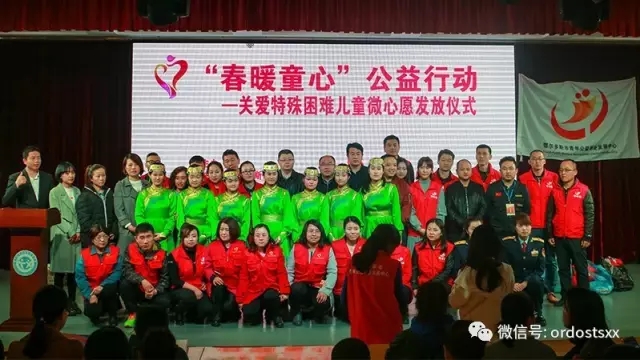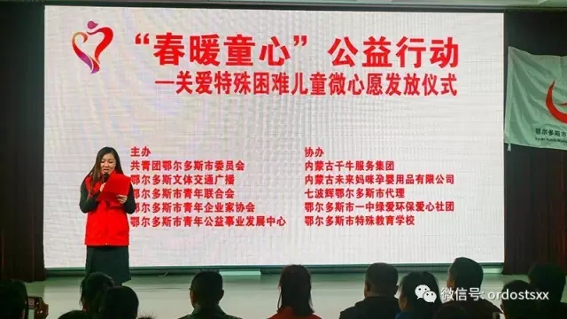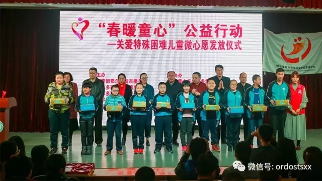 3月15日上午,由共青团鄂尔多斯市委员会、鄂尔多斯文体交通广播、鄂尔多斯市青年联合会、鄂尔多斯市青年企业家协会、鄂尔多斯市青年公益事业发展中心主办的——“春暖童心”公益活动在市特殊教育学校隆重举办。来自团市委领导、企业赞助代表、青公益志愿者、爱心群众55人参加了此次活动。