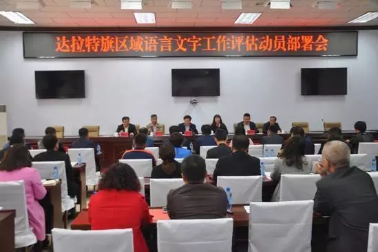 根据国家、自治区和市人民政府的工作要求及部署,在全面完成国家三类城市语言文字规范化建设达标并于2015年顺利通过评估验收的基础上,近日,达拉特旗人民政府、旗汉语言文字工作委员会组织召开区域语言文字工作评估动员部署会,全面推进基层语言文字规范化工作。