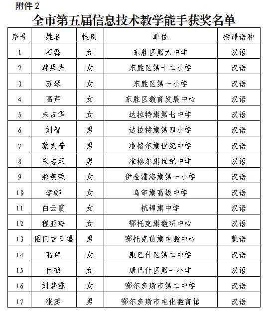 全市第八届信息技术教师课堂教学基本功大赛和第五届信息技术教学能手评选活动已圆满结束,经评委公平、公正评审,共评出基本功大赛一等奖22名、二等奖15名,教学能手17名,现将评选结果予以公布(获奖名单见下表)。希望获奖教师珍惜荣誉,再接再厉,为提升我市中小学信息技术教学水平做出新的贡献。