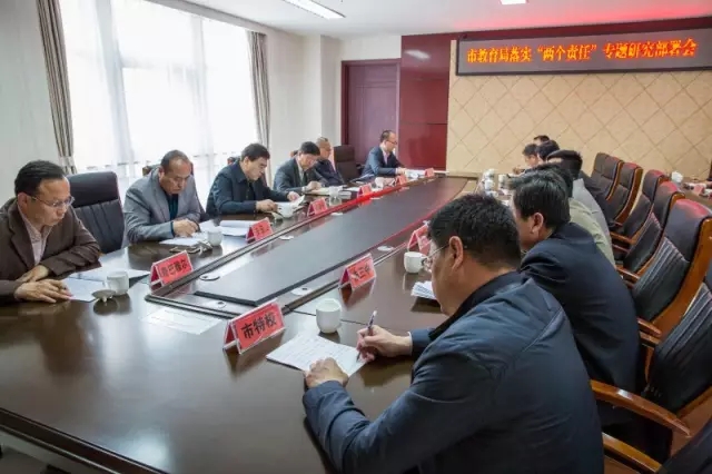5月2日上午,市教育局召开落实“两个责任”专题研究部署会议,学习传达了市纪委《进一步强化党风廉政建设主体责任和监督责任传导机制实施方案》。会议由市教育局党组书记、局长樊俊平同志主持,局领导班子成员、直属单位党组织工作负责人和局相关科室负责人参加了会议。