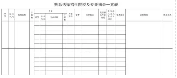通过熟悉推荐院校,可以掌握填报志愿的基本要领和技能。在正式填报志愿前这段时间,考生在熟悉推荐院校的基础上,如果推荐院校没有比较适合自己的学校,还要结合往年相关招生院校的录取情况,根据自身成绩等实际,来熟悉其他一些录取最低分位次与自己位次相匹配、本人比较中意的学校,而且都要做好摘抄记录,最后把自己熟悉过的备选学校统一做成一张表格(如下表表样)。