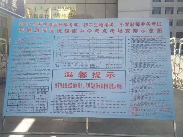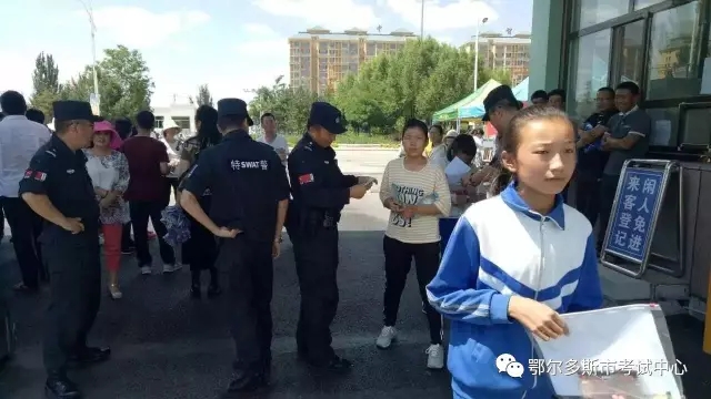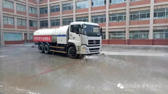 在鄂前旗中学考点,由于天气炎热,学校安排洒水车入校进行洒水作业,为考生创造了舒适、凉爽的考试环境。在东胜区二中和鄂旗高级中学考点,公安民警维持考点周边的道路状况,帮助考生处理应急事项,全力做好考生服务工作。
