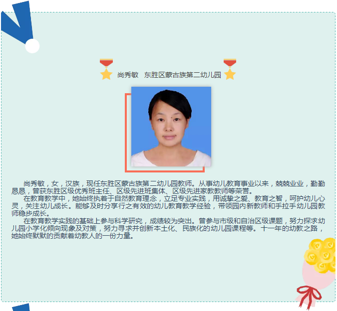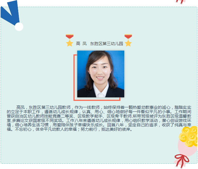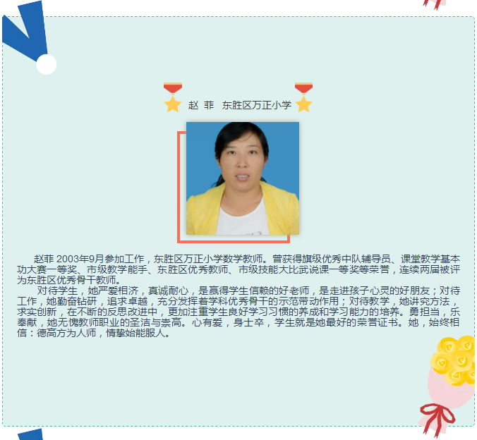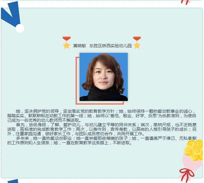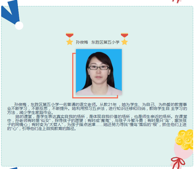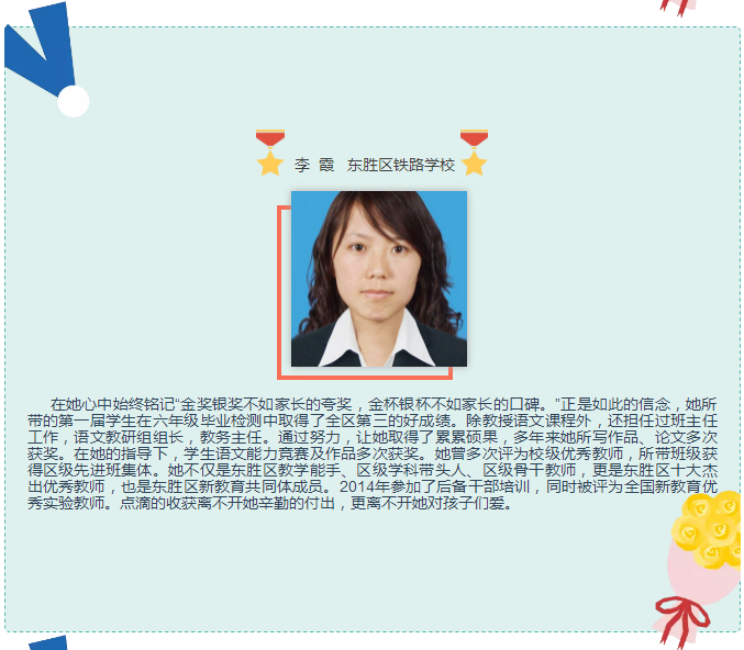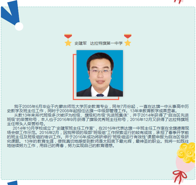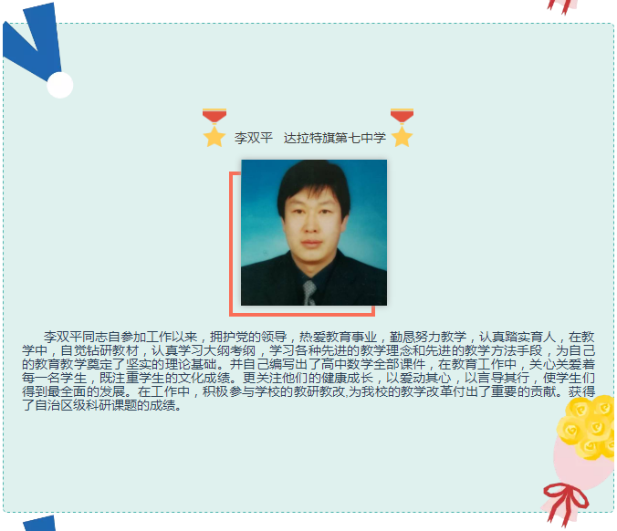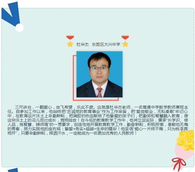 他在教育的长河里摆渡,在知识的海洋里导航,把每一个40分钟用汗水和智慧编织成无数个耀眼的光环,用信任和鼓励引导每一位学生进步,用真诚和辛勤铸造班级的整理实力,展现了一位辛勤园丁的风范。
