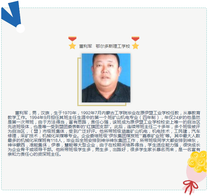 静能春风化雨,润物无声;动能点石成金,琢璞成器。班主任,没有级别的主任,却担当着最大的人生责任。校园里,总能见到你们步履匆匆的身影;教室内,总能听到你们谆谆善诱的话语。可敬可赞,教学之路上挥洒着你们的青春和才华;亦师亦友,育人之途中流淌着你们的辛勤和奉献。