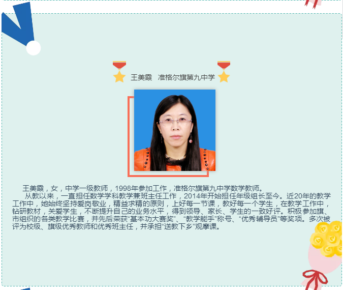 他在教育的长河里摆渡,在知识的海洋里导航,把每一个40分钟用汗水和智慧编织成无数个耀眼的光环,用信任和鼓励引导每一位学生进步,用真诚和辛勤铸造班级的整理实力,展现了一位辛勤园丁的风范。