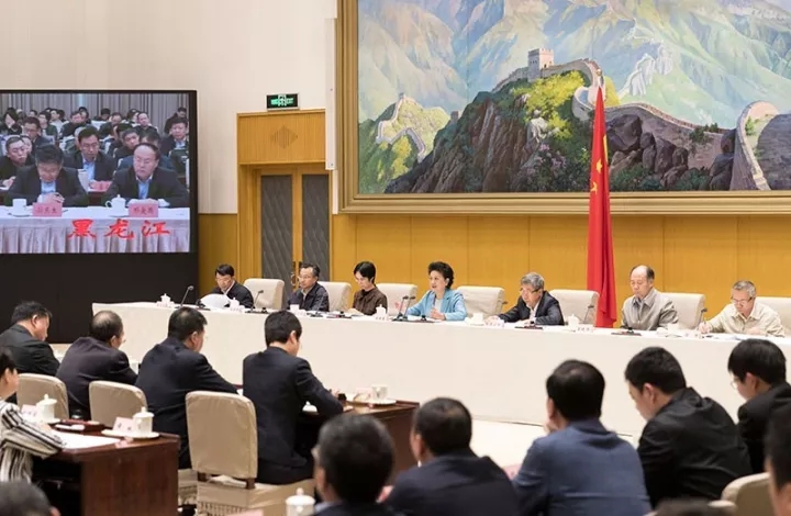 10月9日,中共中央政治局委员、国务院副总理刘延东在北京出席贯彻落实《关于深化教育体制机制改革的意见》电视电话会议。(新华社记者 丁海涛 摄)