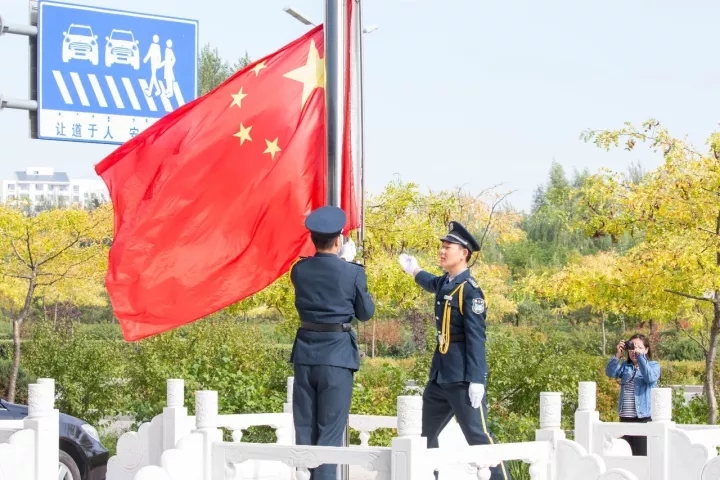 上午10:30,伴随着雄壮的国歌声起,鲜艳的五星红旗冉冉升起,迎风飘扬。现场人员全体肃立,行注目礼,齐唱国歌,共同表达对祖国母亲生日的祝福,喜迎党的十九大胜利召开。