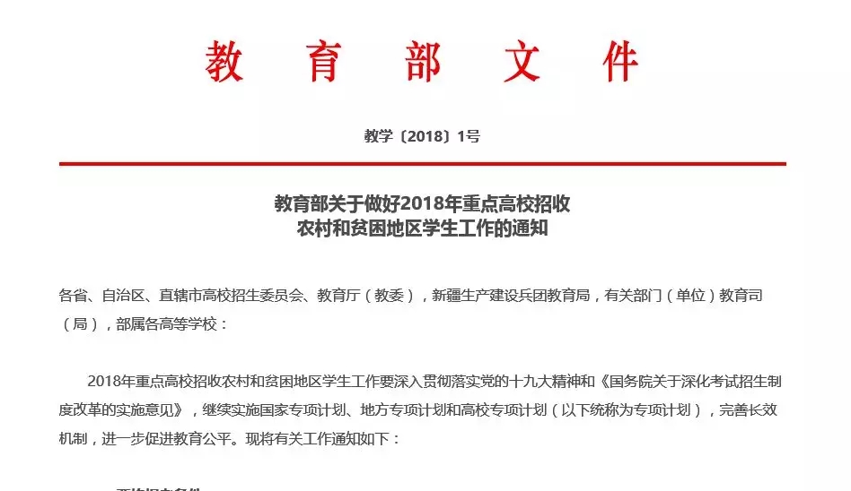 为贯彻党的十九大精神,落实《国务院关于深化考试招生制度改革的实施意见》和《政府工作报告》,近日教育部印发《关于做好2018年重点高校招收农村和贫困地区学生工作的通知》,明确2018年继续实施重点高校招收农村和贫困地区学生的国家专项计划、地方专项计划和高校专项计划,并对相关工作进行了全面部署。