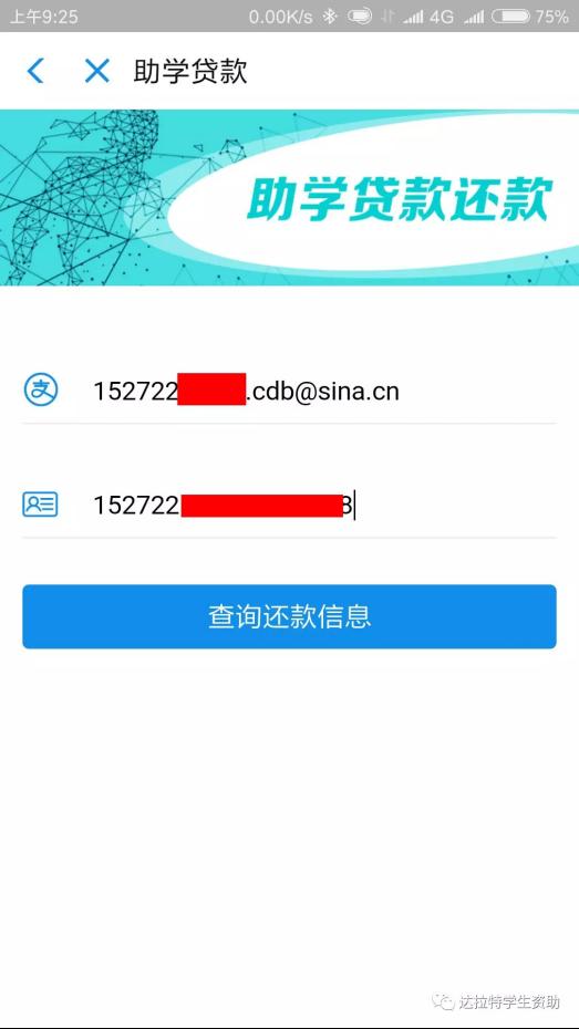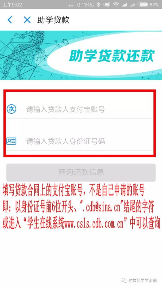 输入助学贷款支付宝账户、身份证号码,点击【查询还款信息】