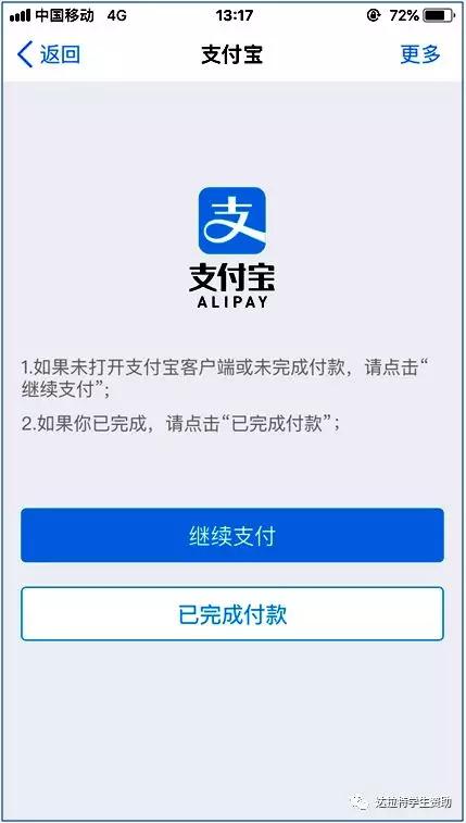 如果未打开支付宝客户端或未完成付款,点击【继续付款】
