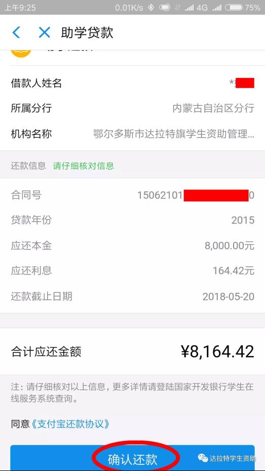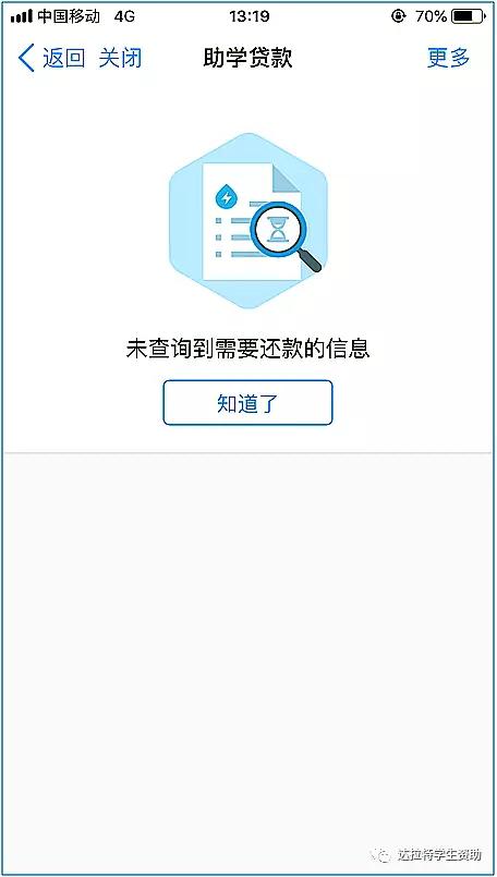 如无还款信息则显示以下信息,不需进行还款操作【提前还款需先申请再还款,具体流程关注“达拉特学生资助”公众号查询】