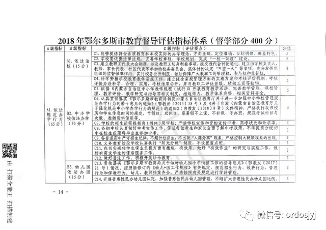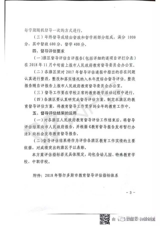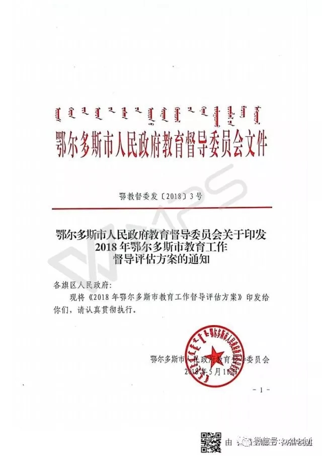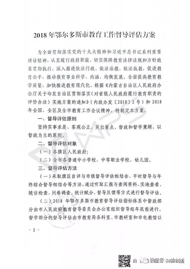 近日,鄂尔多斯市人民政府教育督导委员会根据《内蒙古自治区人民政府办公厅关于印发自治区贯彻落实对省级人民政府履行教育职责的评价办法实施方案的通知》(内政办发〔2018〕2号)精神,在广泛征求各方意见的基础上,研究制定了《鄂尔多斯市人民政府教育督导委员会关于印发2018年鄂尔多斯市教育工作督导评估方案的通知》(鄂教督委发〔2018〕3号)。
