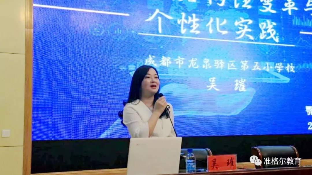 成都市龙泉驿区第五小学校长吴璀以《教学结构变革与个性化阅读实践》为题,介绍了所在学校阅读活动的开展情况,分享了阅读教学、阅读改革、阅读普及的做法经验。