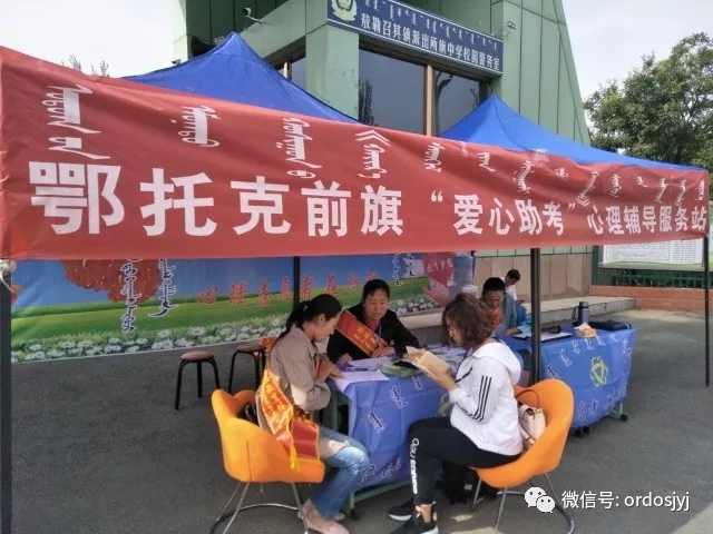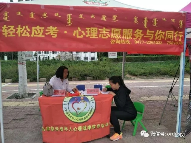 6月7日至8日,“温情高考 你我同行”爱心助考活动在全市8个服务点有序开展,总计有107位教育系统心理健康教育工作者参与了本次心理志愿服务活动。两天累计发放心理健康宣传普及资料4334份,现场接待、辅导考生及家长401人。活动得到了社会各界的广泛认可和关注,效果明显。东胜区、乌审旗、鄂托克旗前旗在活动现场均接受了媒体采访。
