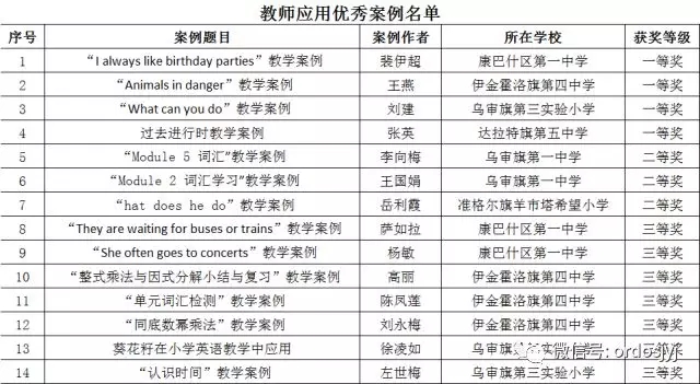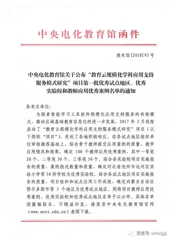 近日,中央电化教育馆公布了“教育云规模化学科应用支持服务模式研究”项目第一批优秀试点地区、优秀实验校和教师应用优秀案例名单,全国共评审5个优秀试点地区,50所优秀实验校,教师应用优秀案例一等奖20个、二等奖30个、三等奖50个。鄂尔多斯市在本次评选中取得佳绩,鄂尔多斯市电化教育馆被评为优秀试点地区,康巴什第一中学等6所学校被评为优秀实验学校,14名教师获应用优秀案例奖。