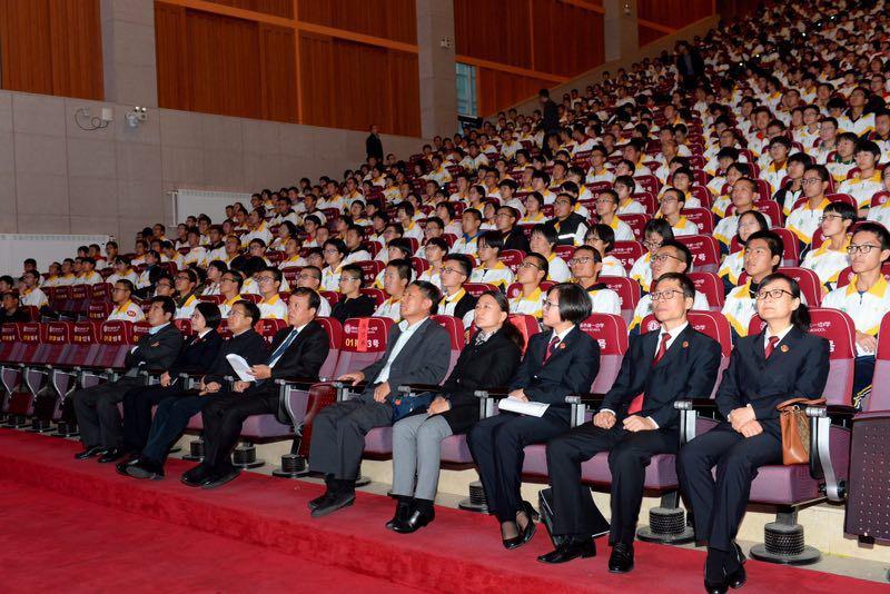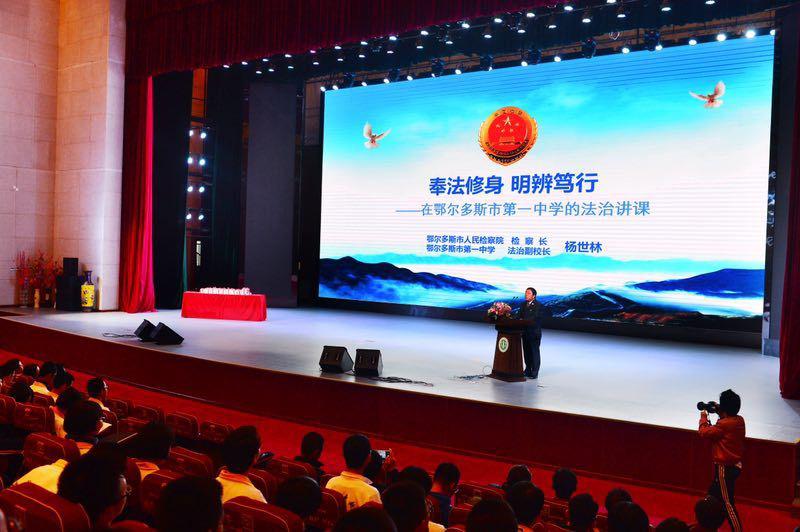 为贯彻中共中央《关于全面推进依法治国若干重大问题的决定》中所提出的“坚持把全民普法和守法作为依法治国的长期基础性工作,深入开展法治宣传教育,引导全民自觉守法、遇事找法、解决问题靠法;把法治教育纳入国民教育体系,从青少年抓起,在中小学设立法治知识课程”等要求,进一步增强鄂尔多斯市第一中学学生法治意识,使其能够掌握更多法律知识,自觉学法、守法、用法,10月19日下午,市一中与市检察院联合举办了“大检察官进校园法制教育活动”。鄂尔多斯市人民检察院党组书记、检察长杨世林为市一中高一师生带来一堂以“奉法修身,明辨笃行”为主题的法治课。