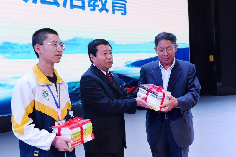 杨世林代表检察机关向市一中赠送法治图书,白玉亮校长和学生代表共同代表学校接受赠书