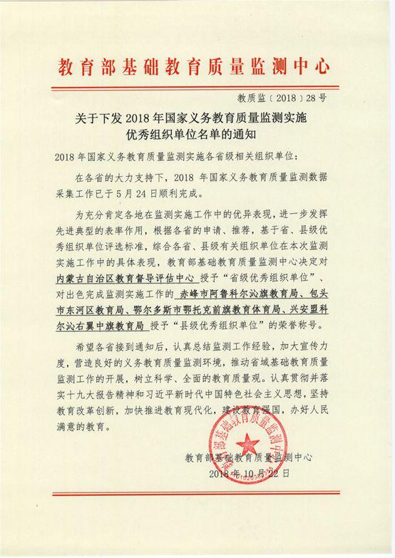 鉴于鄂托克前旗教育体育局在国家义务教育质量监测实施工作中的优异表现,2018年10月22日,教育部基础教育质量监测中心授予鄂托克前旗教育教体局“县级优秀组织单位”荣誉称号。