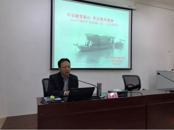 当天上午,广安市委党校副校长雷盛成作题为“不忘建党初心,牢记复兴使命”的讲座。雷校长结合ppt演示,运用大量的史实数据,深入浅出地分析中国共产党成立的历史背景即“一大”召开的经过,详细剖析了“一大”代表的人生之路。