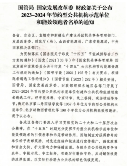 “节约型公共机构示范单位”是由国家机关事务管理局(国管局)、国家发展和改革委员会、财政部三部委联合组织评选的国家级权威荣誉,是推动公共机构带头节能、形成绿色发展方式的战略性举措,在引领全社会绿色风尚、推动生态文明建设方面具有强大的示范效应和政治意义。