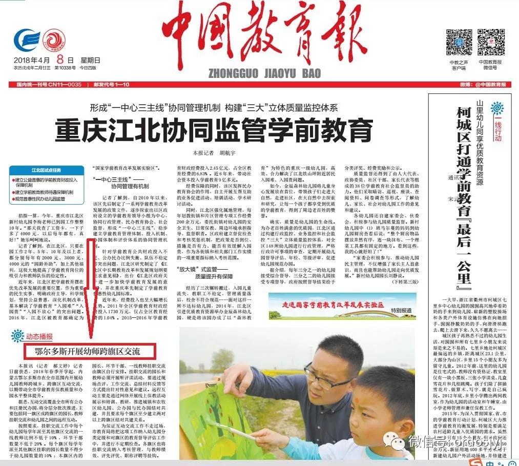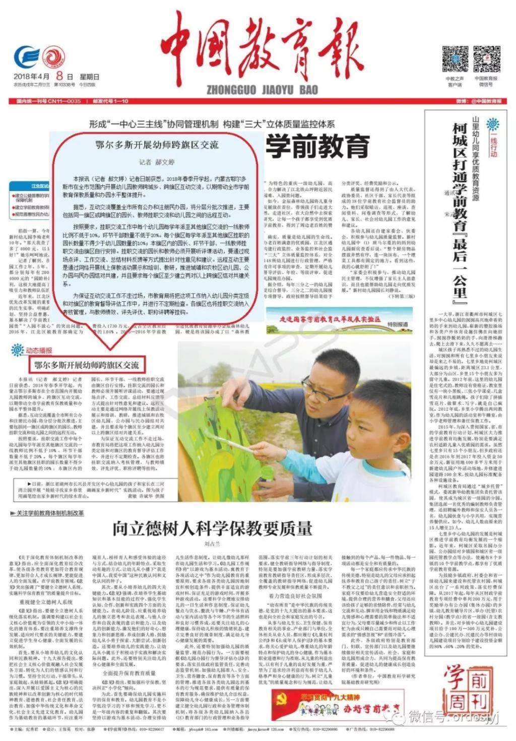 2018年4月8日,中国教育报以《鄂尔多斯开展幼师跨旗区交流》为题,对我市幼儿教师互动交流工作在头版进行报道,介绍了我市幼儿教师互动交流的范围、数量、工作要求、监督考核等情况。